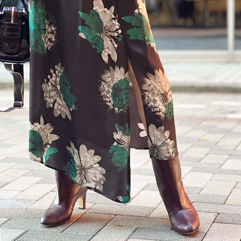 揺らぐ、波打つ、花のスカート。秋の幕開けはシックなカラーを纏ったフラワープリントとともに。ソフトでいてそれでいてシャープさがあり、想像をかきたてられるスカート。軽くなめらかなファブリックはさらりと肌に心地よく、スタイルに洗練をもたらす。トップとシューズのバーガンディが季節のメッセージ。