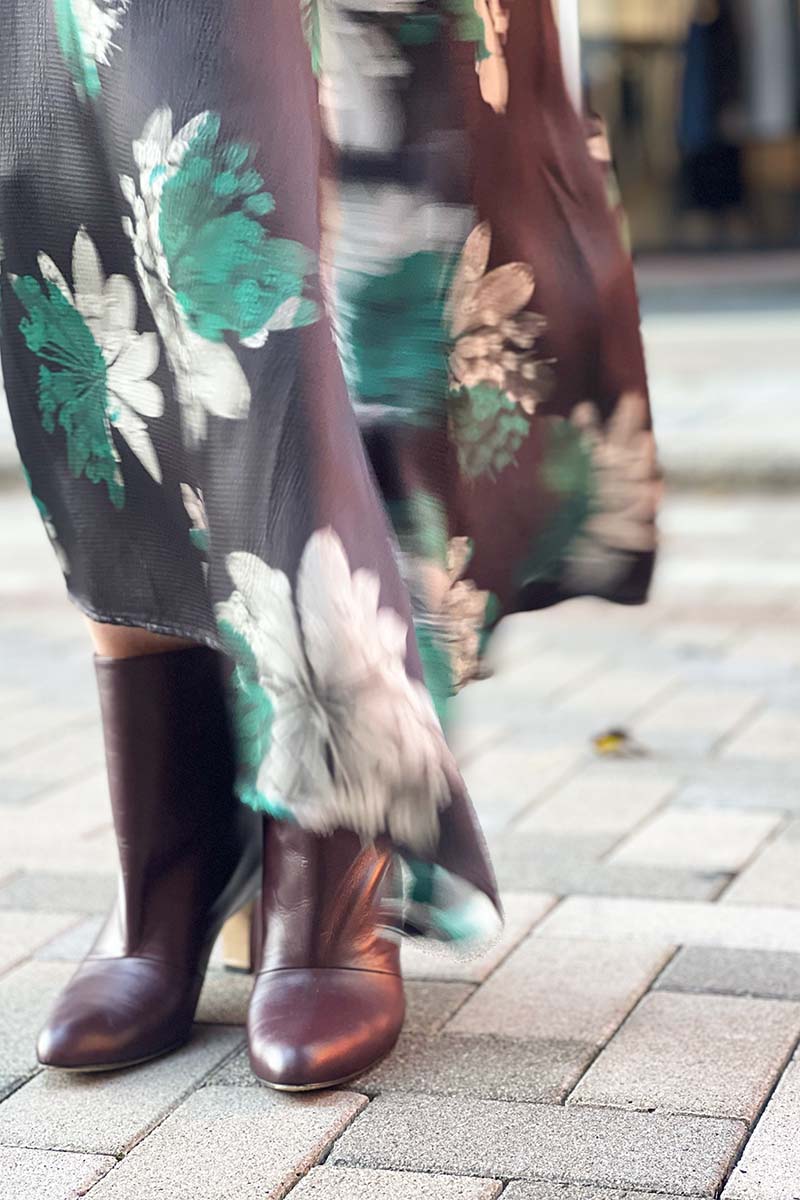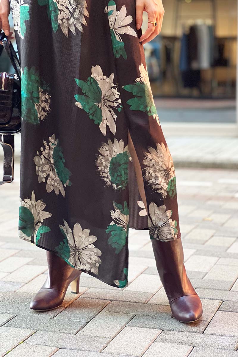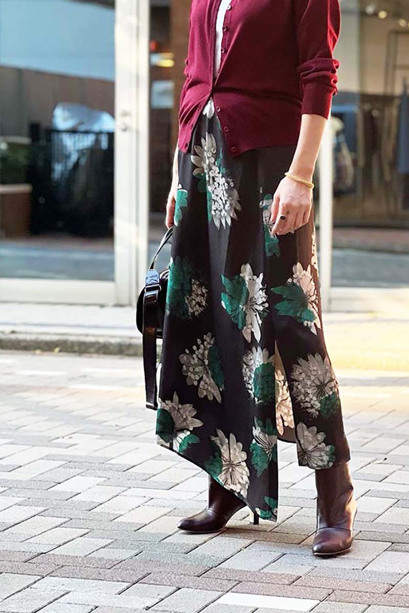 揺らぐ、波打つ、花のスカート。秋の幕開けはシックなカラーを纏ったフラワープリントとともに。ソフトでいてそれでいてシャープさがあり、想像をかきたてられるスカート。軽くなめらかなファブリックはさらりと肌に心地よく、スタイルに洗練をもたらす。トップとシューズのバーガンディが季節のメッセージ。