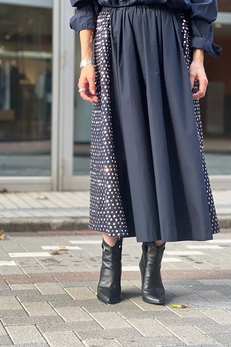 シンプルなコットンロングのギャザースカートにネイビーブルー。真面目で清楚なふたつの要素、それらをまるでスタッズみたいな、輝くスパンコールでアレンジ。ちょっとヤンチャななんとも楽しいスカートです。トップにはワークなシャツを合わせて清楚とカジュアルのテイストミックス。ブランドやアイテムの「ありきたりさ」に影響されてしまわずに、あらゆるものが本来持っている美しさ__“本質”を見いだして、自分のルールで、自分が着たいように、着る自由。あなたの毎日に「本質」は、いくつありますか?