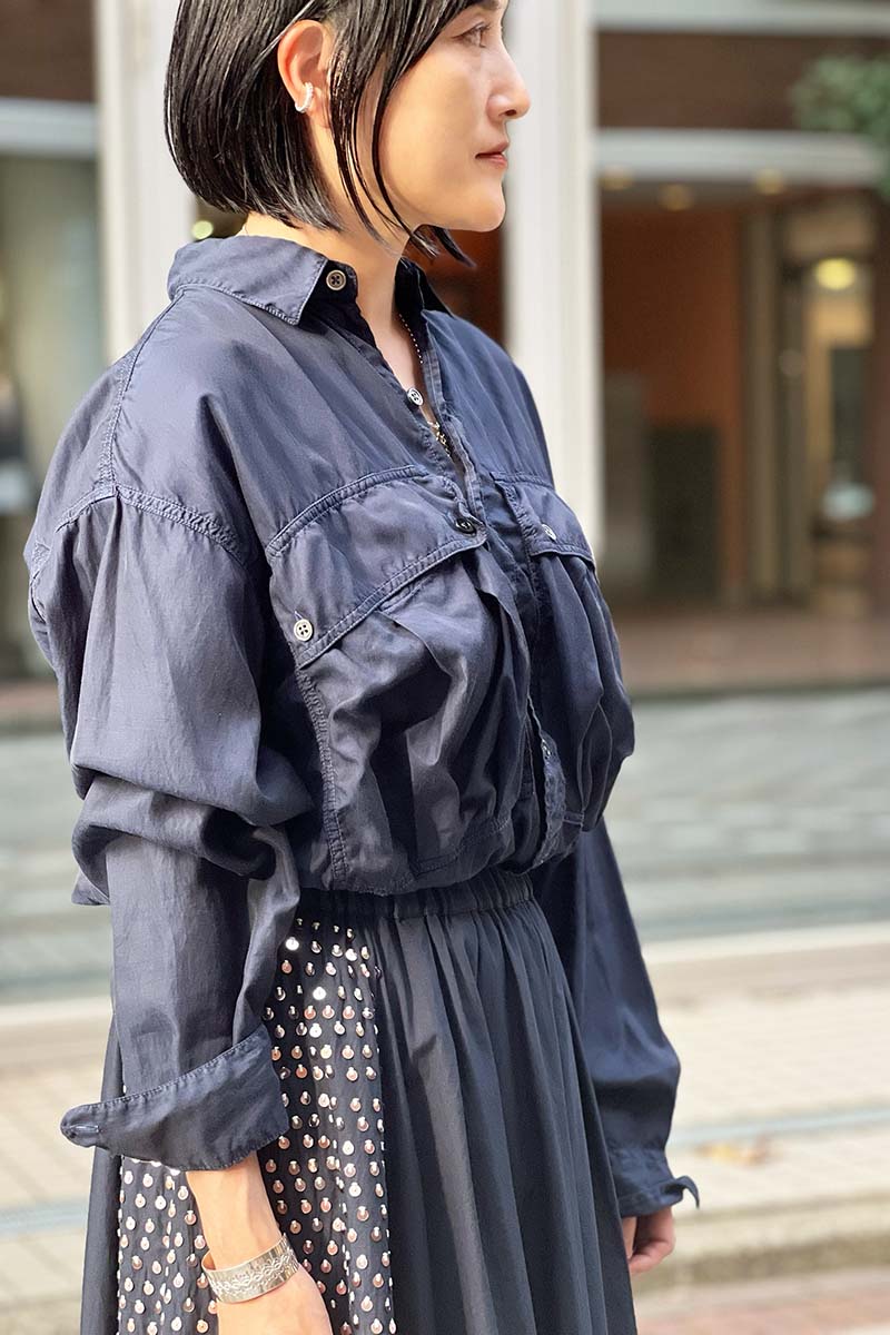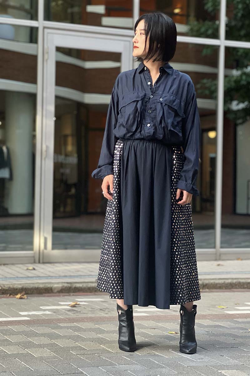 シンプルなコットンロングのギャザースカートにネイビーブルー。真面目で清楚なふたつの要素、それらをまるでスタッズみたいな、輝くスパンコールでアレンジ。ちょっとヤンチャななんとも楽しいスカートです。トップにはワークなシャツを合わせて清楚とカジュアルのテイストミックス。ブランドやアイテムの「ありきたりさ」に影響されてしまわずに、あらゆるものが本来持っている美しさ__“本質”を見いだして、自分のルールで、自分が着たいように、着る自由。あなたの毎日に「本質」は、いくつありますか?