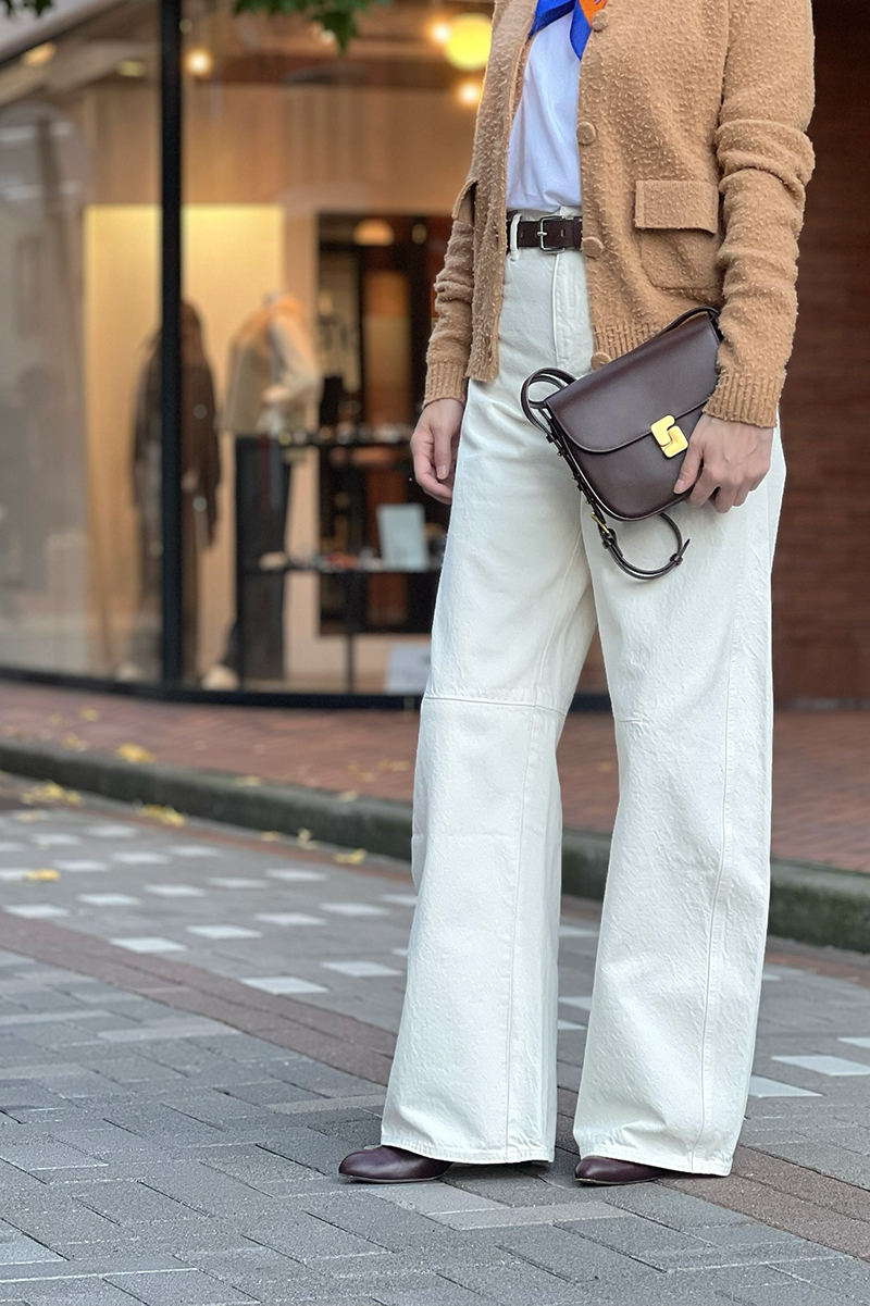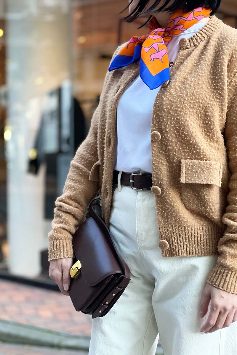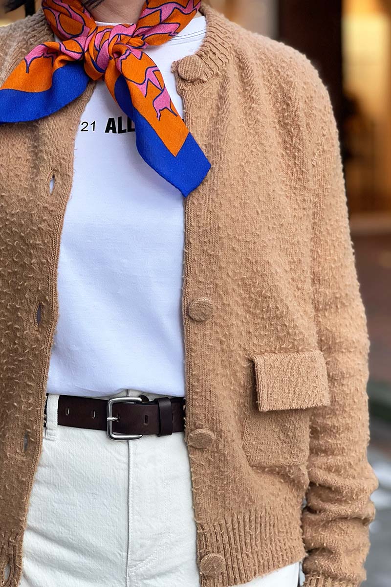 いま改めて新鮮に感じるのがカーディガンというアイテム。ヴィンテージを思わせるこんなクルーネックのカーディガンは、どこかフレンチシックも香り立つ、オーセンティックなアイテムです。あえてあしらわれたネップモチーフが存在感たっぷりで、シルクやカシミヤなどエレガントでシリアスなムードともまた違い、遊びごころを感じさせるのがこのニットの素敵なところ。そんな“素敵”をカジュアルにコーディネイト、インにはTシャツを合わせるのがおすすめのレイヤードスタイル。自由で軽快、こんなスタイルを楽しめてしまうところに、ファッションの醍醐味があります。
