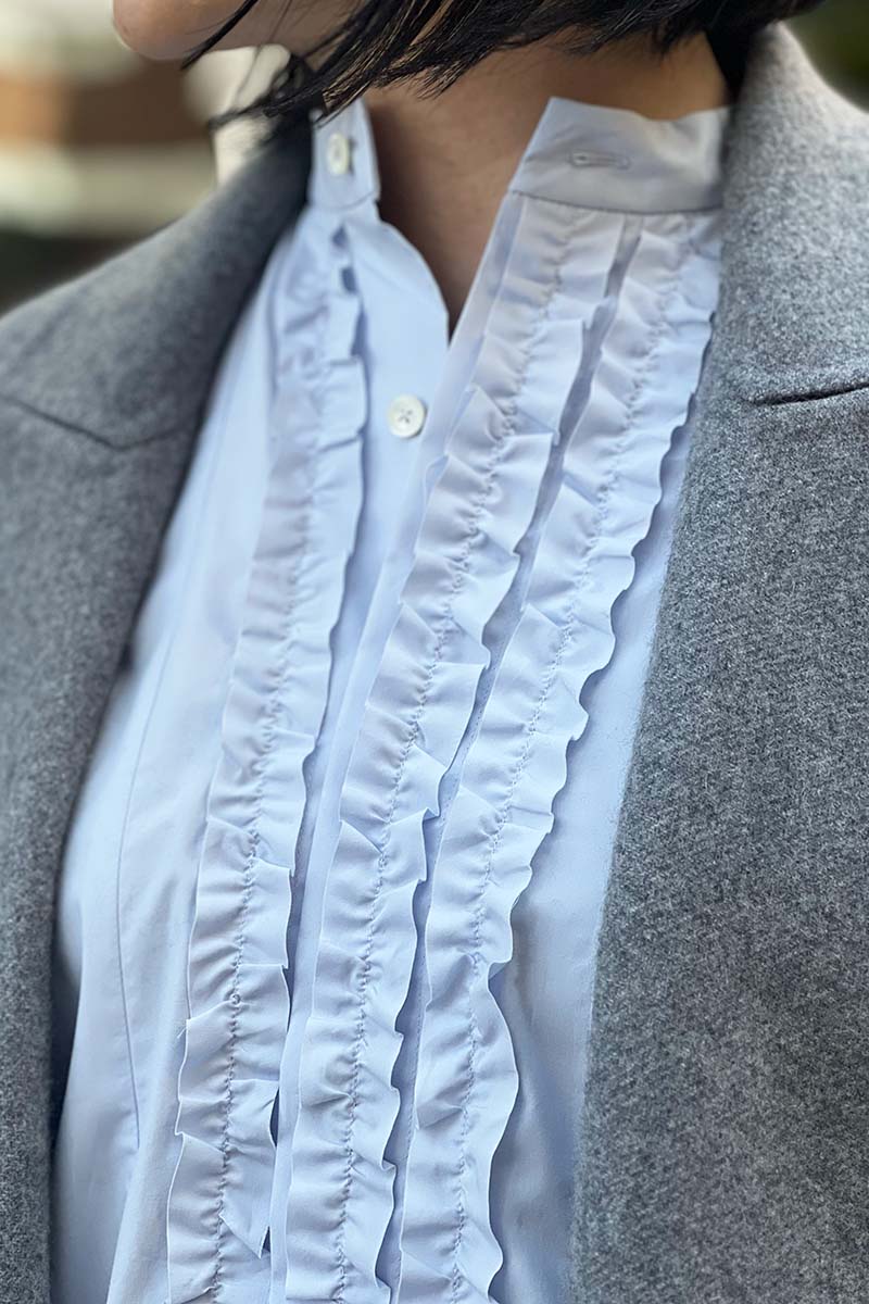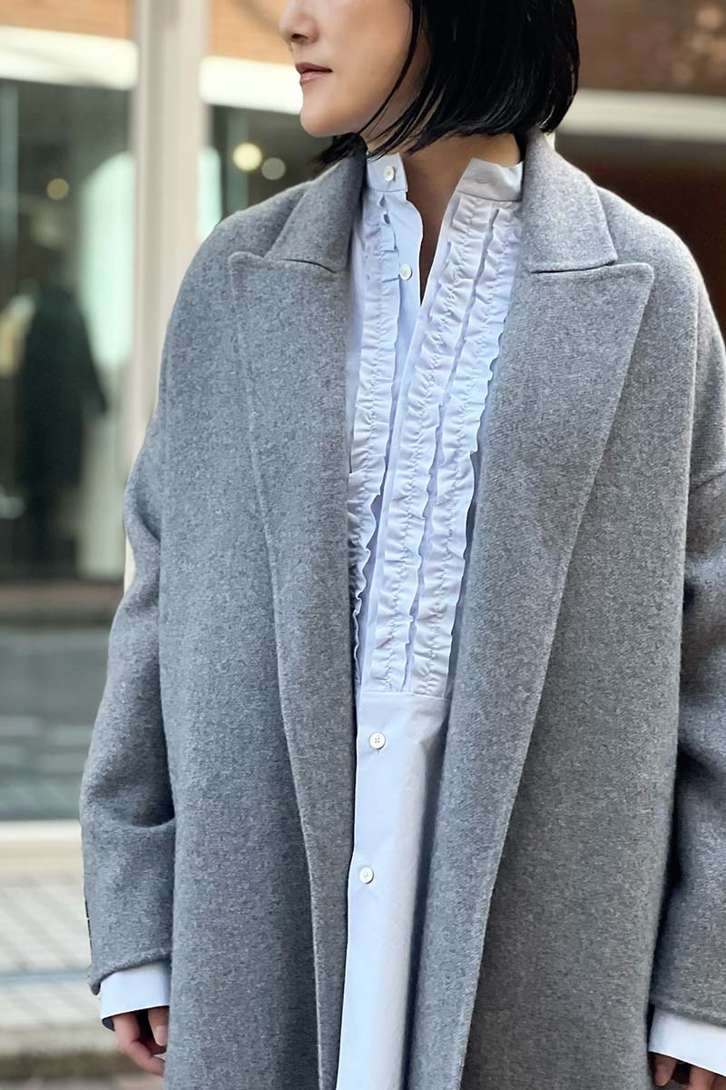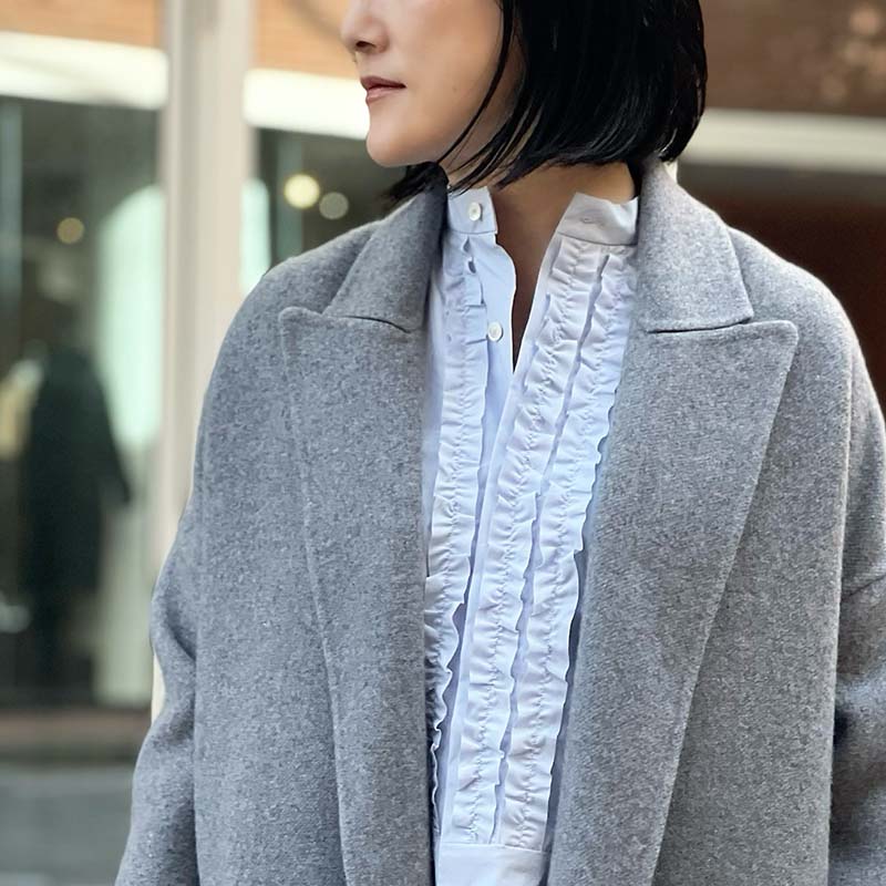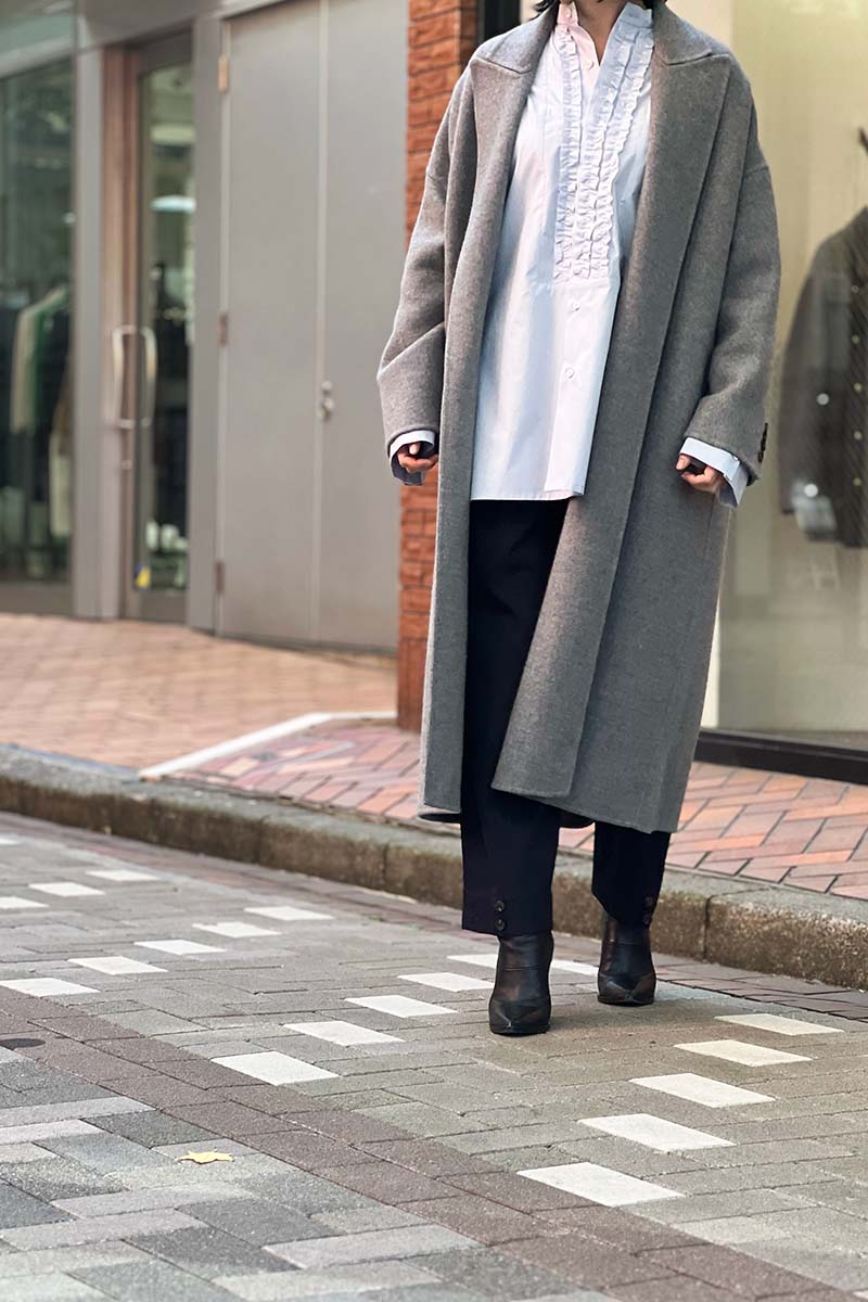 着る人を知性で包み込み、一時の流行に左右されない。上質なテイラードアイテム、なかでもコートは、ファッションの経験を積んだ女性たちが最も必要としているものかもしれません。空気をはらんで生まれるシルエットは、もちろん美しい。けれど私たちが描く「カシミア100%」の華奢でデリケートなイメージを鮮やかに裏切ってくれるそのたたずまいは、どこかカジュアルでスポーティー。まもなくやってくる本格的な冬も、これさえあれば怖くない、と思わせてくれる極上の一枚です。インにはコットンのブラウスを合わせてニットとはまた別の、「質感のコントラスト」を楽しむ着こなしを。