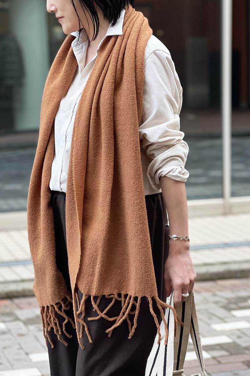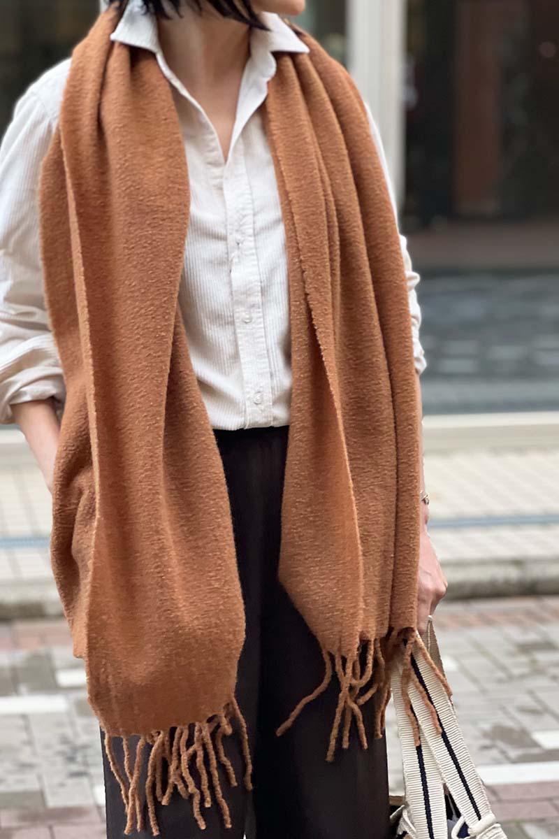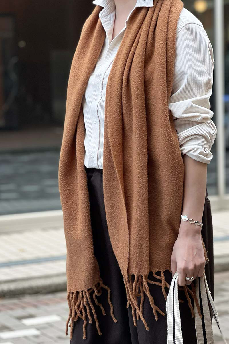 冬のおしゃれを暖かく、そして華やかに彩るアイテムとして定番のストール。上質な素材選びはもちろん、ポイントは長めにとられたフリンジ。“ネイティブ”なアクセントが楽しくて、バッグやジュエリー、合わせたアクセサリーもそんなムードをチョイスしてみた。ボリュームが出過ぎないから顔周りがすっきりするのもいい。自分で楽しむのもいいけれど、好きな誰かにプレゼントしたくなるような、洗練された温かみあふれるアイテムだ。
