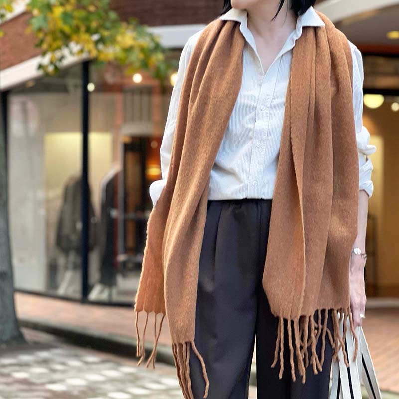 冬のおしゃれを暖かく、そして華やかに彩るアイテムとして定番のストール。上質な素材選びはもちろん、ポイントは長めにとられたフリンジ。“ネイティブ”なアクセントが楽しくて、バッグやジュエリー、合わせたアクセサリーもそんなムードをチョイスしてみた。ボリュームが出過ぎないから顔周りがすっきりするのもいい。自分で楽しむのもいいけれど、好きな誰かにプレゼントしたくなるような、洗練された温かみあふれるアイテムだ。