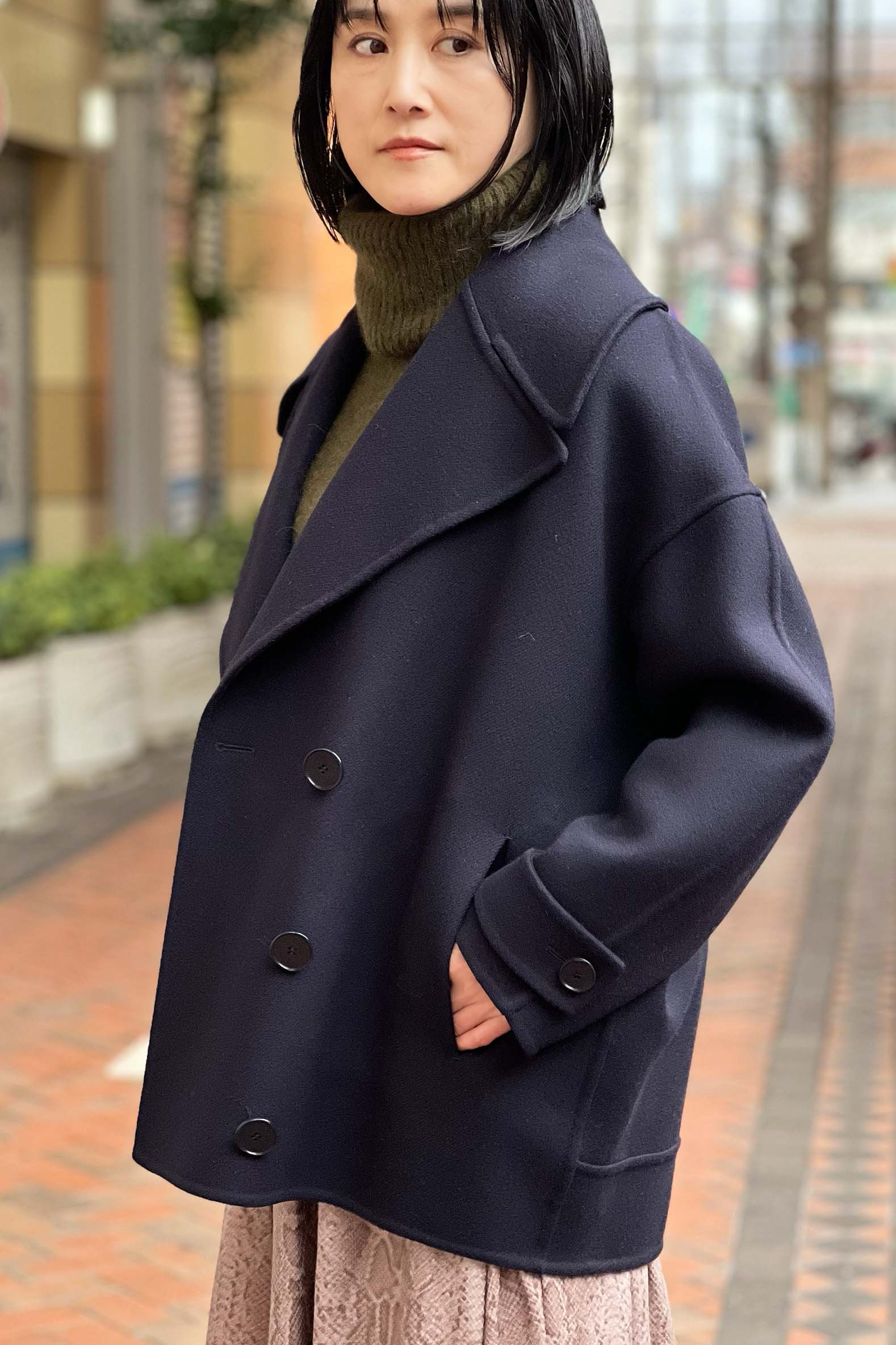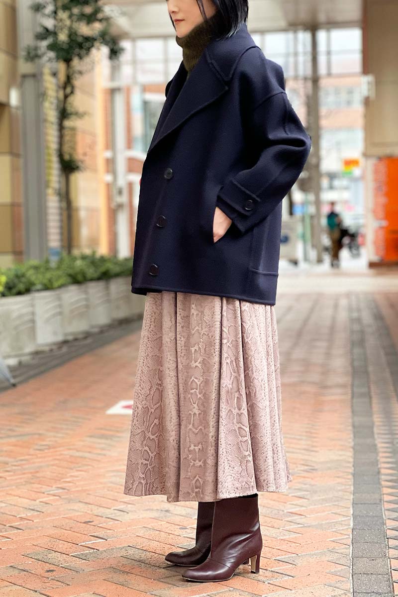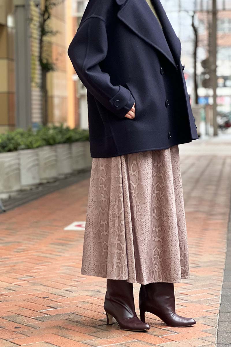 上品さや知的さ、まじめさを表すとされるネイビーが、パイソンプリントと出会うことで、黒とはまったくべつのエレガンスを表現しているのが新鮮。ネイビーはすっきりとシンプルで、ストレートにデザイン自体を主役としてみせることができる。時代を問わない美しさ、何にも影響されない上質さを演出する、ネイビーブルー。そのひかえめな偉大さに、あらためて魅了されてしまう着こなしです。