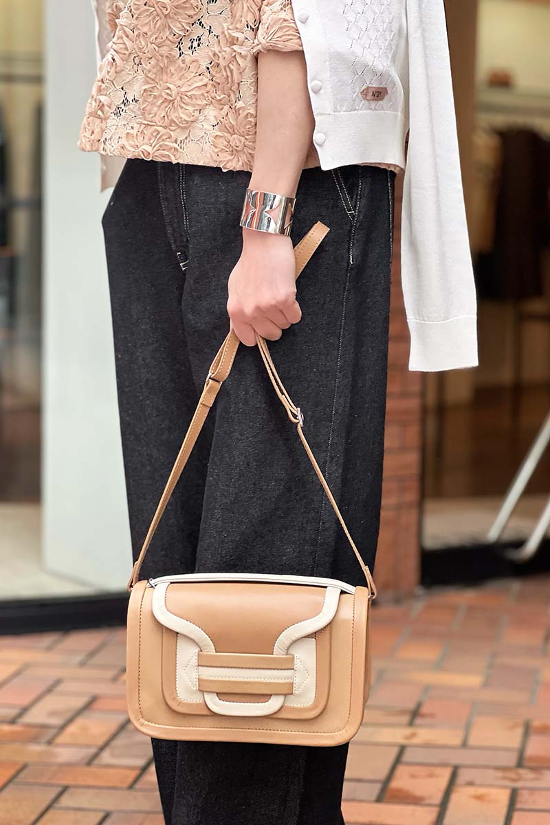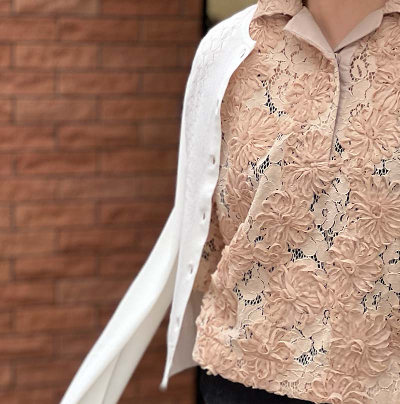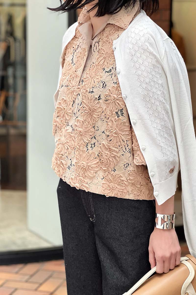 シーズンのスタートにあたって、今回テーマにしたのは「レース」。二種類のテクスチャーを重ねた美しいブラウスは、女性らしいのはもちろん、ポロシャツを思わせるスポーティーでユースフルなフォルムがなんとも新鮮。重ねたカーディガンとバングルにも、レースの「透ける」美しさを繰り返したのも今回のポイント。バングルは、硬質なシルバーから覗く肌のコントラストがいい。「レース」の進化を感じる春です。