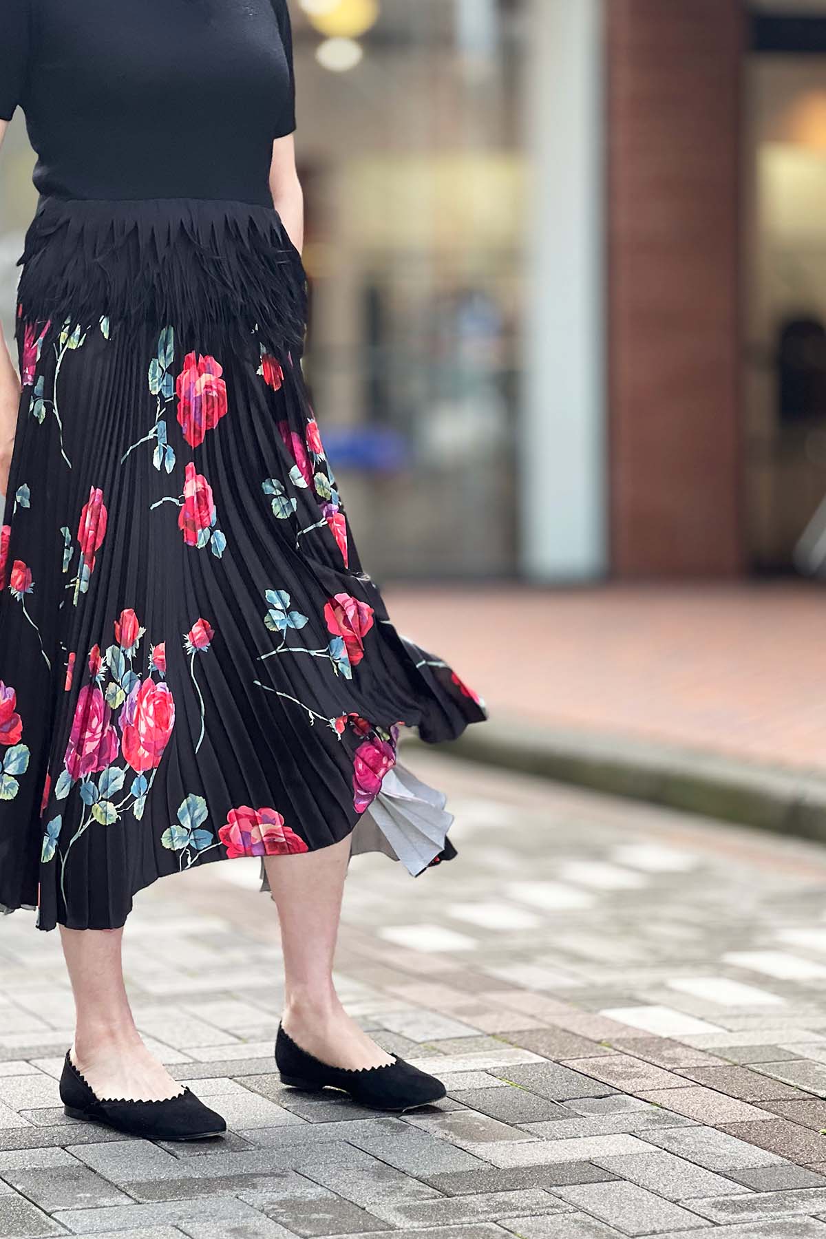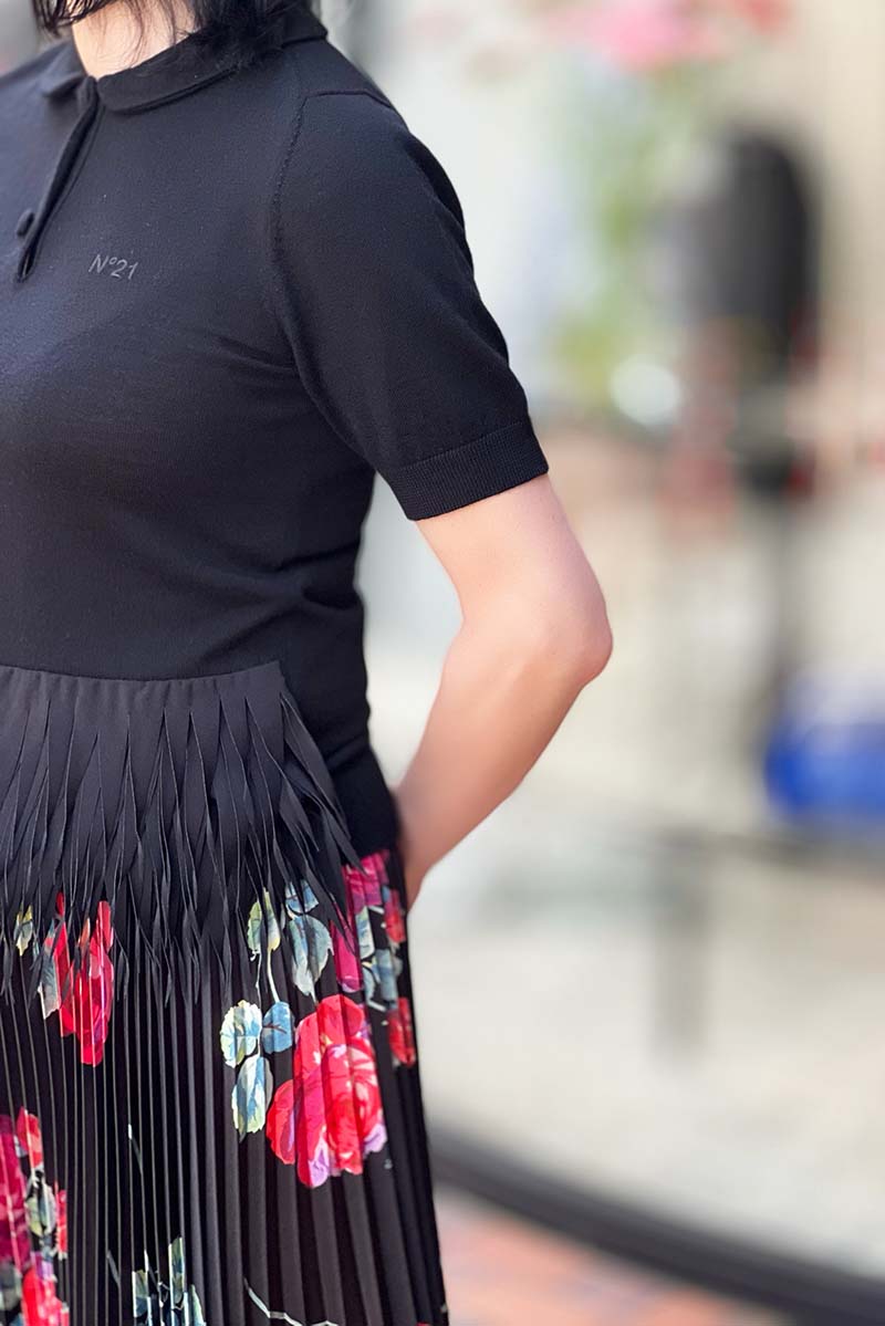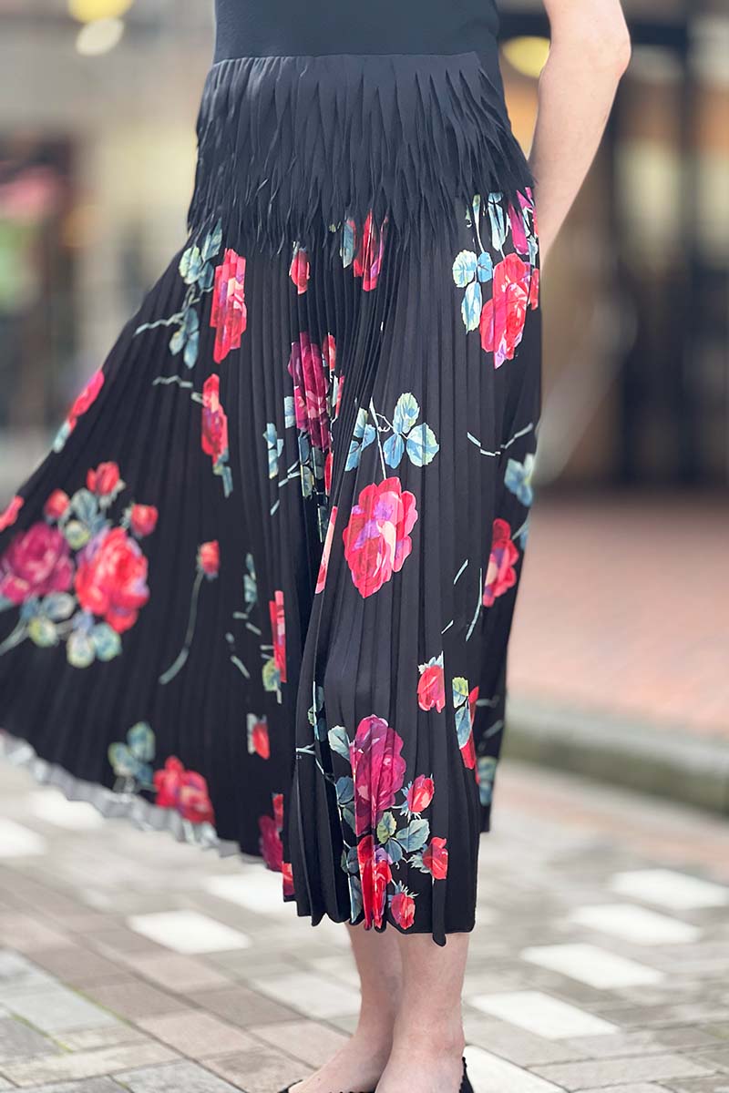 大胆なフラワープリントが遊びごころを感じさせるシックなスカートは、細かなプリーツが描き出すシルエットが美しい。まさに存在感抜群の一着です。これ一枚プラスするだけで女性らしいスタイルが完成するアイテムですが、今季の気分で着るならトップには襟付きのアイテム、こんなポロニットがおすすめ。トラッド×フェミニン、今最も着たい旬のスタイルを楽しんで。
