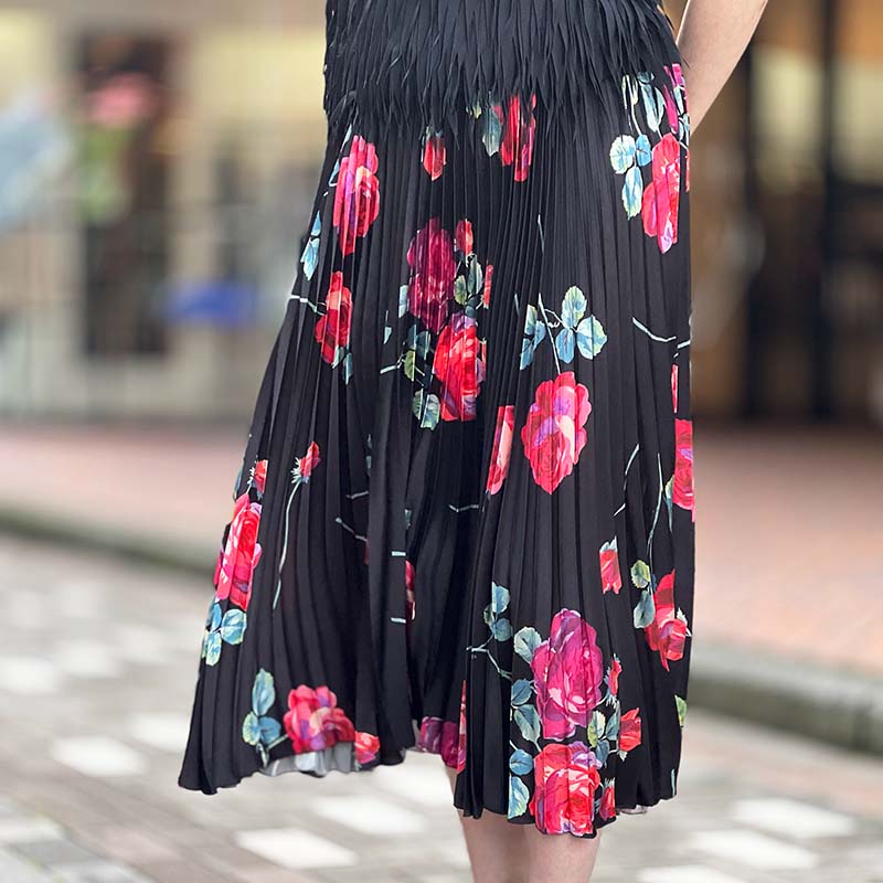 大胆なフラワープリントが遊びごころを感じさせるシックなスカートは、細かなプリーツが描き出すシルエットが美しい。まさに存在感抜群の一着です。これ一枚プラスするだけで女性らしいスタイルが完成するアイテムですが、今季の気分で着るならトップには襟付きのアイテム、こんなポロニットがおすすめ。トラッド×フェミニン、今最も着たい旬のスタイルを楽しんで。