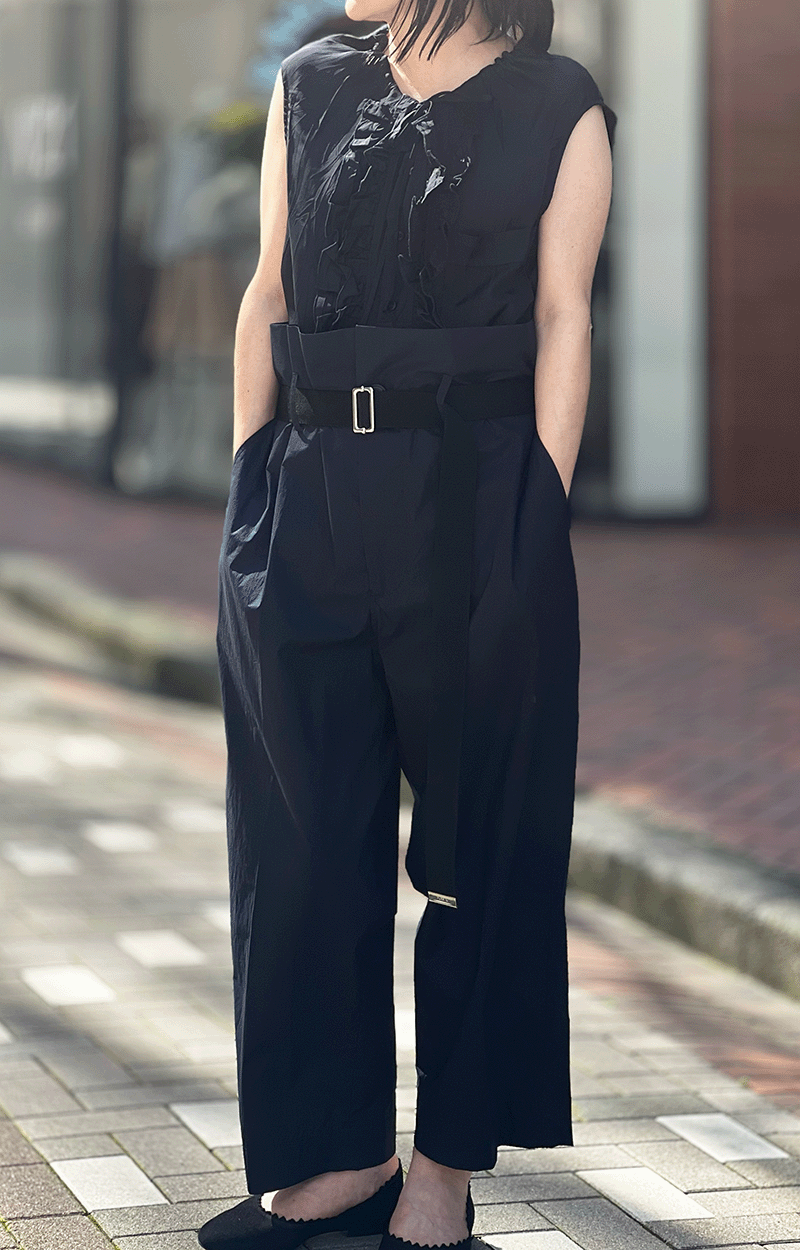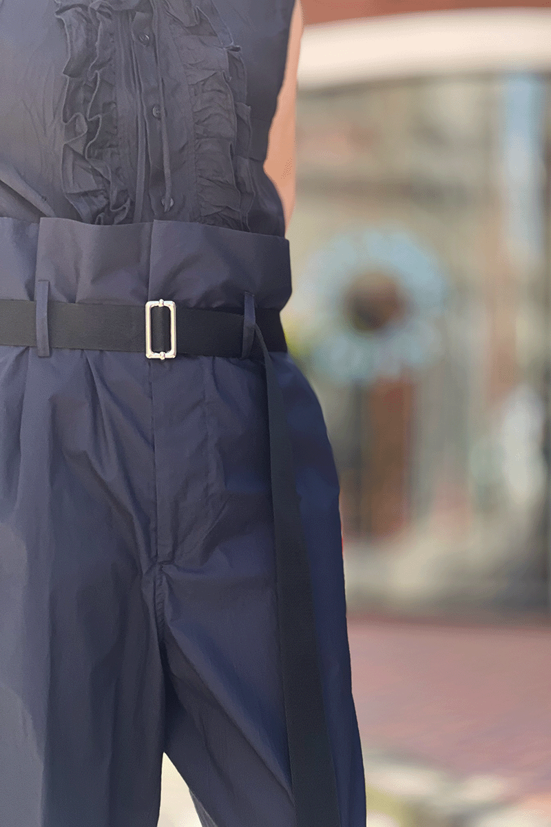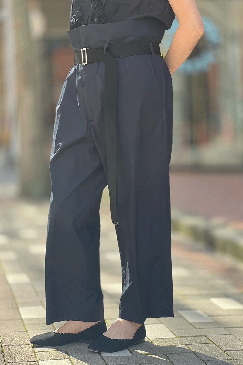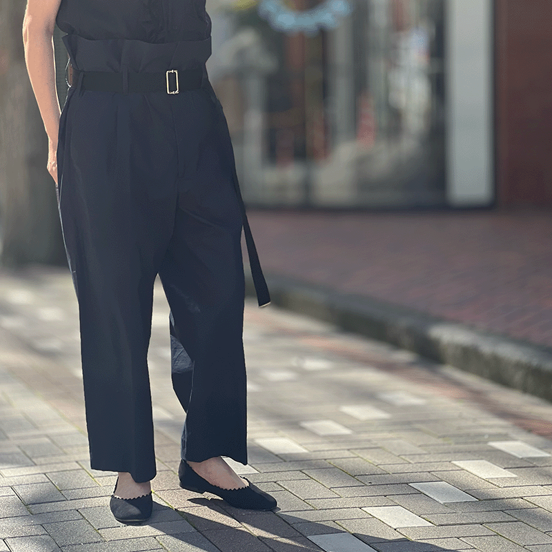 「定番アイテム」のイメージの対極にあるこのパンツ。PLAN C のアイコンパンツ、そう、ブランドの「定番アイテム」です。極端なボリュームをギュッと締めたベルトで演出したシルエットは、とてもユニーク、なんとも個性的。それでも着こなし次第で、カジュアルはもちろん、ワークスタイルまでイケてしまうのが痛快です。流行は超越しているのに着ると心がはずんでくる。上質な仕立てと毎シーズン変わる素材がそう思わせるのかもしれません。今季はネイビーがRIVERUSのおすすめです。